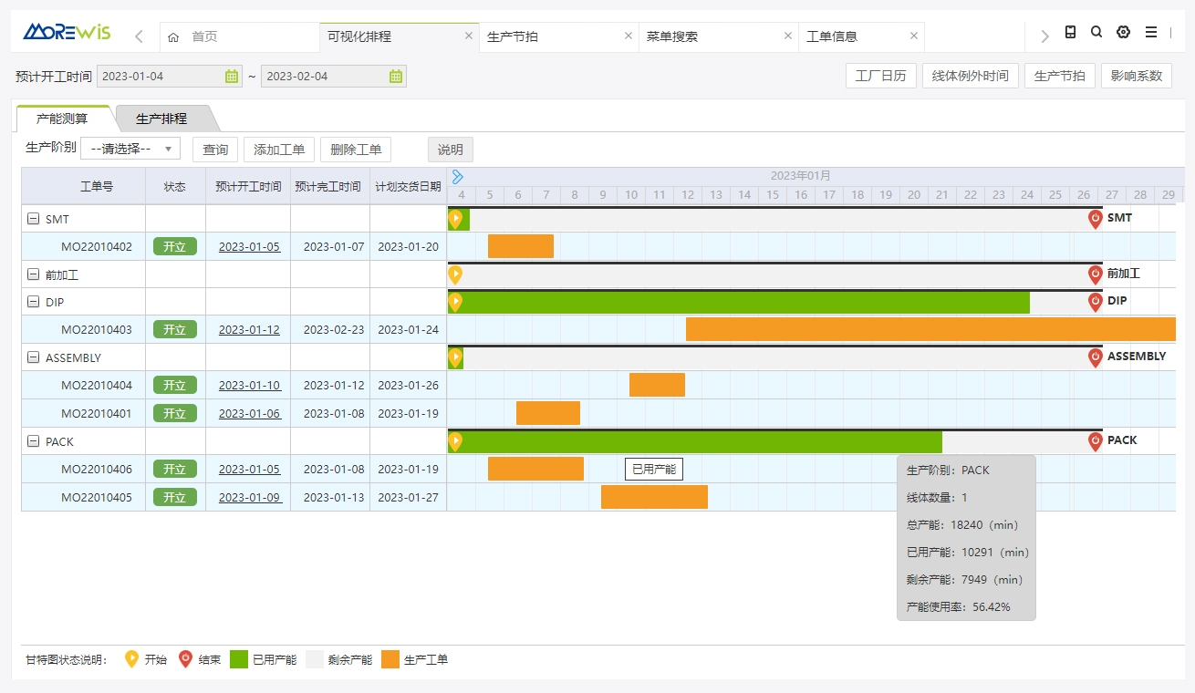 Properly formulated enterprise production plans ensure on-time production and on-schedule delivery from the planning source and directly influence critical operational metrics such as inventory turnover and capital utilization. The Morewis Production Planning and Scheduling System leverages standard production capacities and equipment resource configurations to perform rapid simulation-based scheduling through Gantt chart visualization, helping enterprises establish a cost-efficient, fast-response planning system that enables synchronized production and sales and agile delivery.