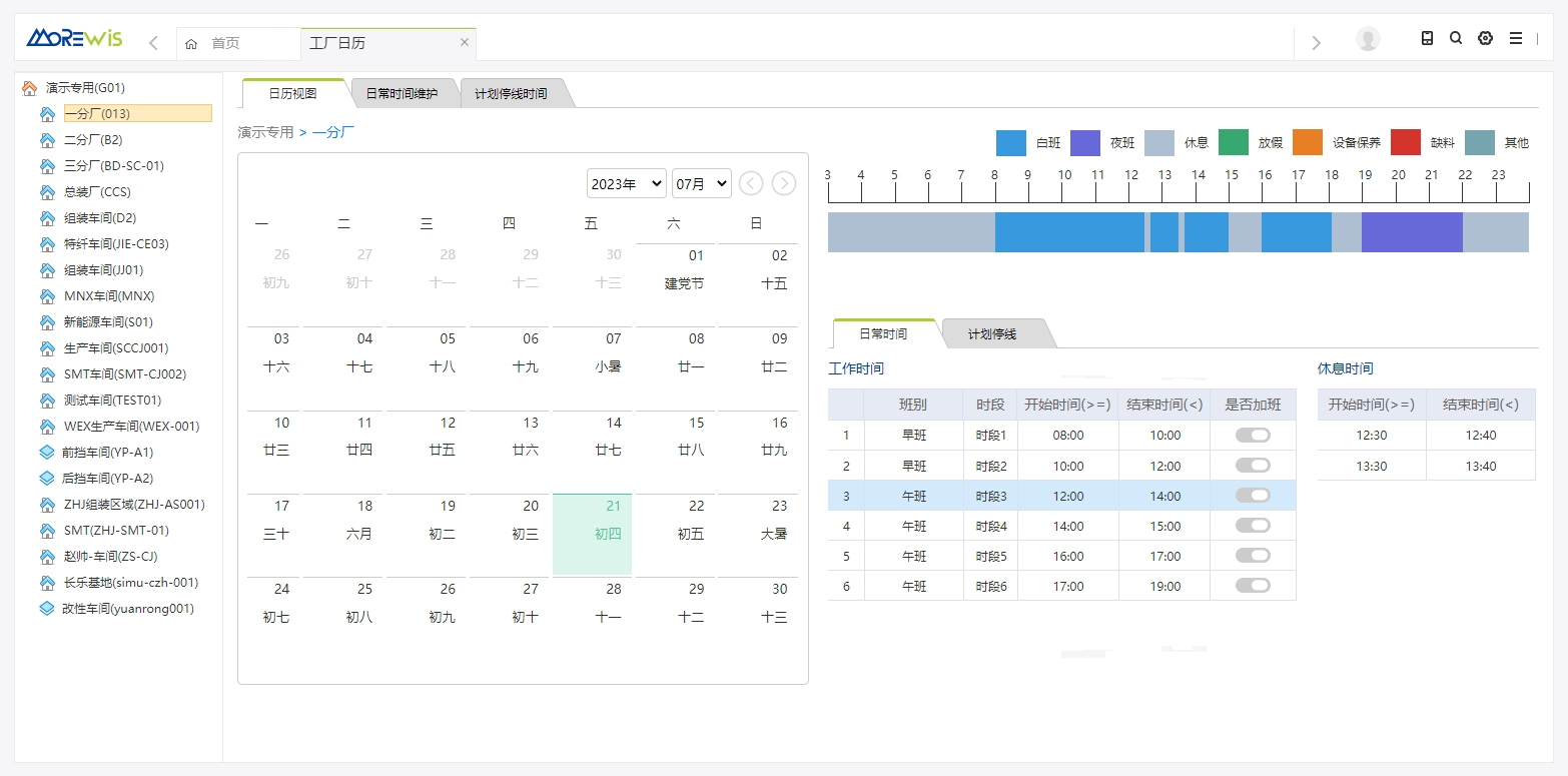 Production Calendar: Supports maintenance of working hours, overtime schedules, and other time-related settings for each workshop and production line.
