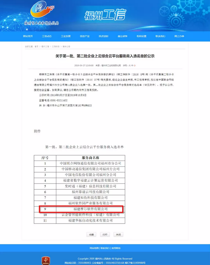 近日,福建省福州市工业和信息化局公示了第一批、第二批企业上云综合云平台服务商提供名单,经过层层筛选、审核,福建摩尔软件有限公司凭借出色的云平台服务能力及卓越的产品体验成功入选,将为福州市制造企业提供上云服务。